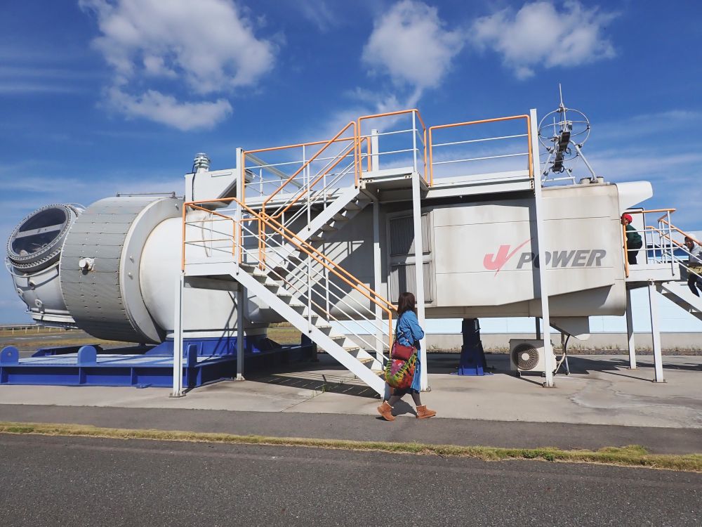 集光追尾型太陽光パネル(太陽に向かって動く太陽光パネル)や風車ナセル(風力発電用風車の風車部分の部屋)の解説は、バスから降りて間近で聞くことができます。