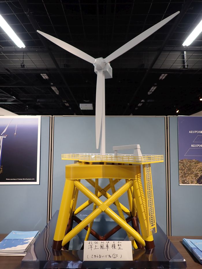 北九州市響灘洋上ウインドファームの解説や、設置される風車の模型もありました。