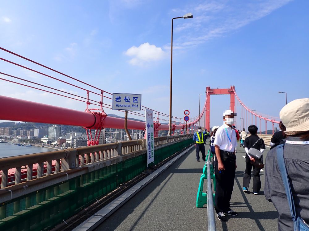 若戸大橋は、若松区と戸畑区を隔てる洞海湾に架かる長さ627メートルの赤い吊り橋です。