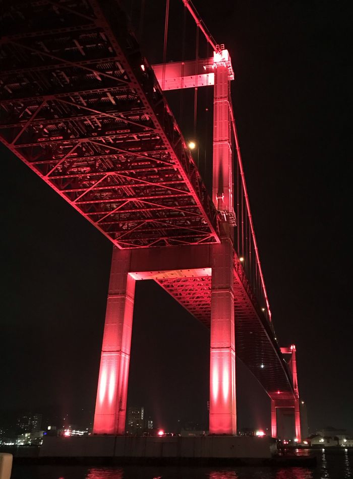 ライトアップされた若戸大橋は、昼間とはまた違った燃え上がるような赤さになります。